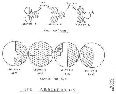 The obscuration drawing in Figure 1-8 shows how the magnetometer canister, the PLS, the boom and the foreground shield obscure the view of the telescope. The obscuration from the rest of the spacecraft could be reduced, if there is an increase in the dynamic envelope due to the change to a Centaur launch vehicle. The foreground shield will be modified, if time allows, so that its support bracket does not obscure the 180 degree end of the LEMMS telescope as shown in the upper portion of the figure. Figure 1-8 was used to illustrate how the foreground shield obscures the 180 degree end of the CMS telescope.