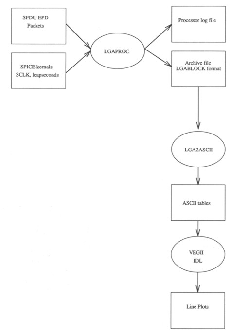 Several plots are attached to this memo showing the results of the LGA processor on several files obtained from GLLSVC in the directory TESTBED:[SBL...]. The plots are generated from data labeled EPD_96-047.PKTS and EPD_96-100.PKTS. The plots are labeled with the files from which they were generated and the channels and sectors plotted. A simple flow chart is also enclosed showing the programs and files used to generate the line plots.