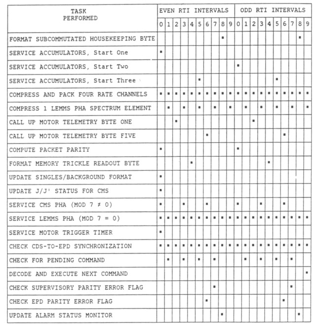 The EPD software establishes and maintains synchronization with the spacecraft via real time clock information that arrives during real time interval number 8 of each packet. This clock information contains the real time interval number, the current MOD 91 value and an indication as to whether the packet is even or odd. Scheduling of the tasks to be performed by the EPD software system is based on the above interrupt structure and on the values of the modulo counters. Figure 2.1 below shows this scheduling scheme for some of the more important tasks.
